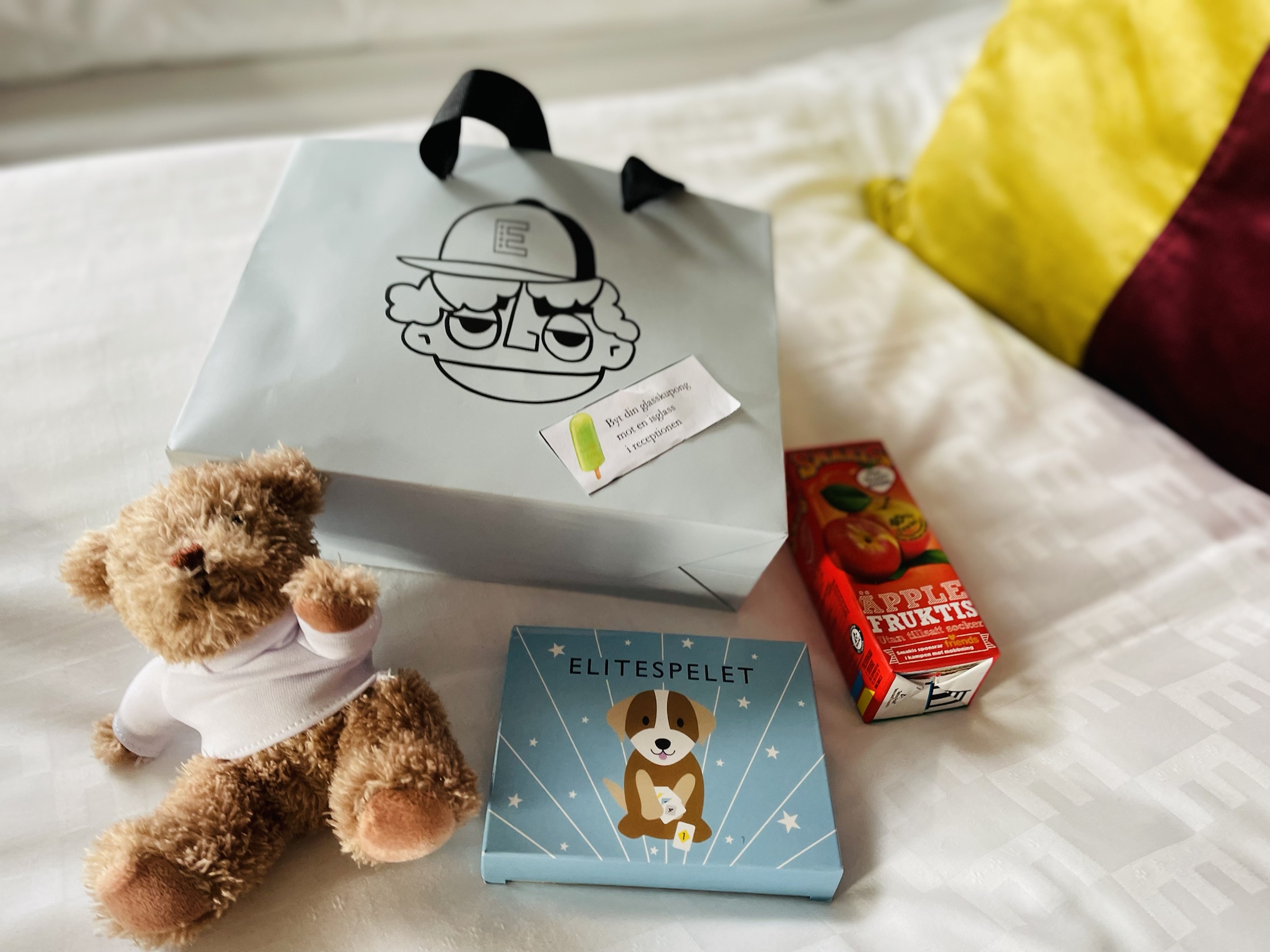När vi checkade in så fick vår son en liten gullig goodiebag. Den innehöll en söt liten nalle, ett kortspel, en festis och sen fick man hämta en isglass i receptionen. Väldigt generöst och fint till alla barn. Stor eloge till Elite Hotels!