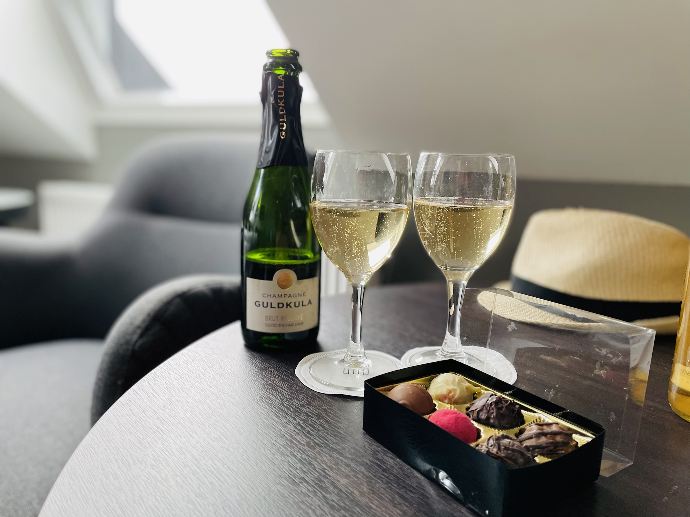 På vårt rum väntade goda chokladpraliner. Det passade alldeles utmärkt till vår lilla goda Guldkula Champagne som vi hade med oss för att fira in semestern!