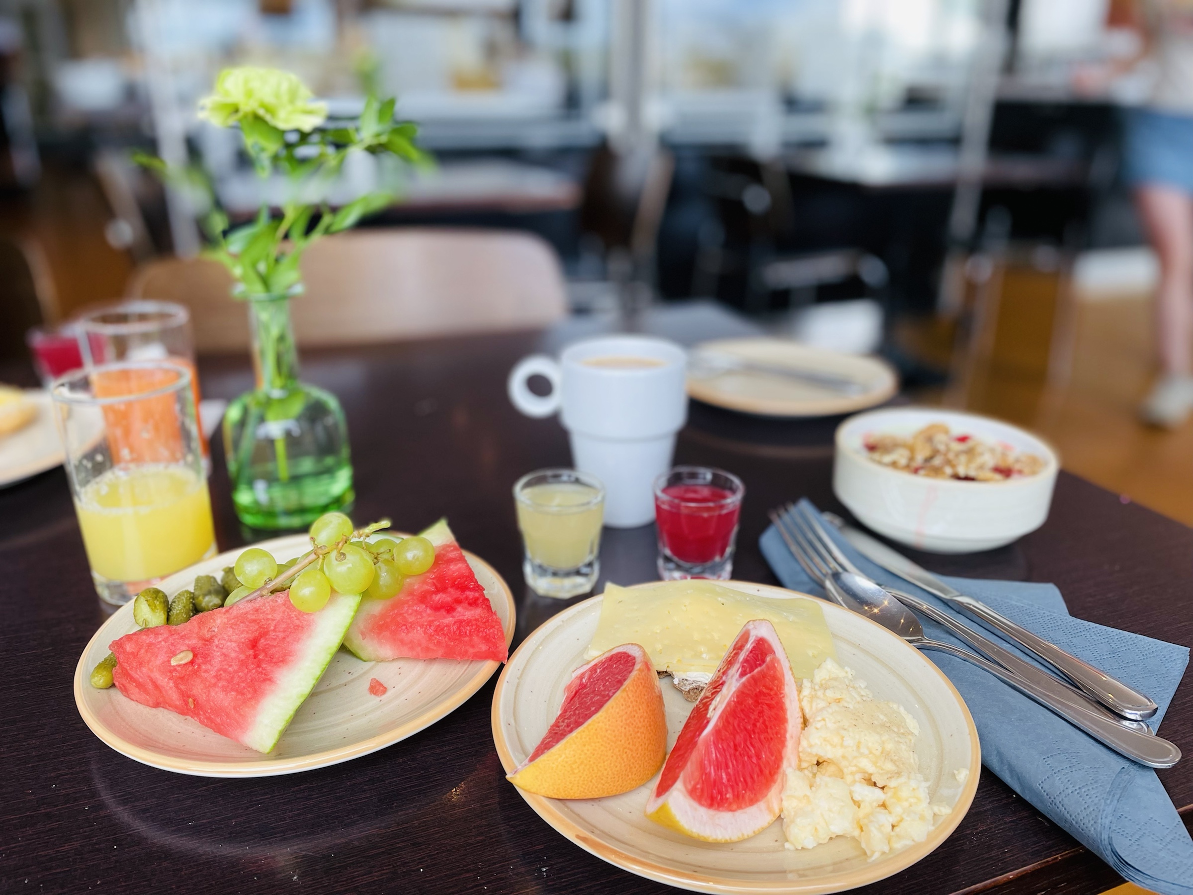 Frukostbuffén på hotellet var riktigt färgglad och fin. Här fanns ett stort utval av varmrätter såsom äggröra, bacon, pannkakor och man kunde göra sina egna våfflor. Sedan kalla pålägg, olika sorters röror, ostar, bröd, yoghurt och mycket annat.