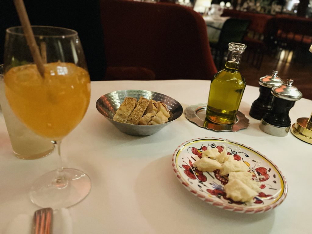 Vi började med en varsin fördrink innan medan vi väntade på denna trevliga smakresa i Norra Italien. Jag drack en L’Avventura Spritz med white peach, Creme de Peche & Prosecco, som var supergod. Eftersom jag hade med mig min äldsta son som älskar matupplevelser, så fick han en alkoholfri PIÑA Colada.