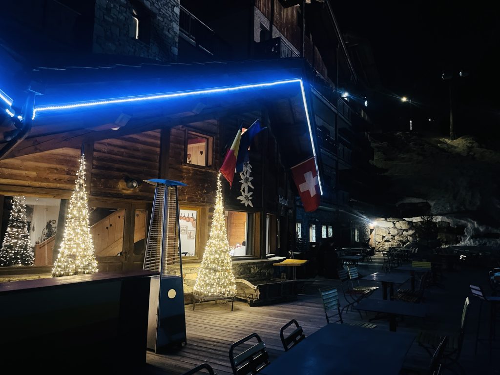 Hotellet ligger mer precis vid skidbackarna, med ski in och ski out. Restaurangens terrass har en panorama vy utöver alperna. Dessvärre har vi en senare sittning, så det är mörkt redan när vi ankommer. Men man ser att utsikten verkligen ser underbar ut. Nästa gång skulle jag gärna vilja bo där.