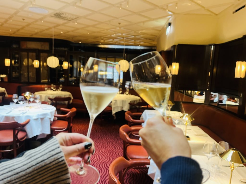 Lunchen inleddes med en skål gott Blanc de Blances bubbel i matsalen, som var fint inredd med bord, stolar, soffor och speglar. Sedan kommer man även kunna se köttkylen med specifika styckningsdelar där.
