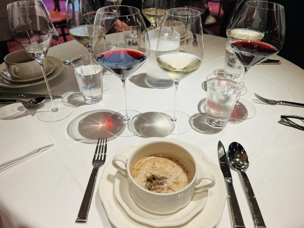 Vi testade oss igenom delar av menyn och första rätten var en svampsoppa med confiterad lök och hyvlad tryffel. En riktigt härlig höst klassiker.