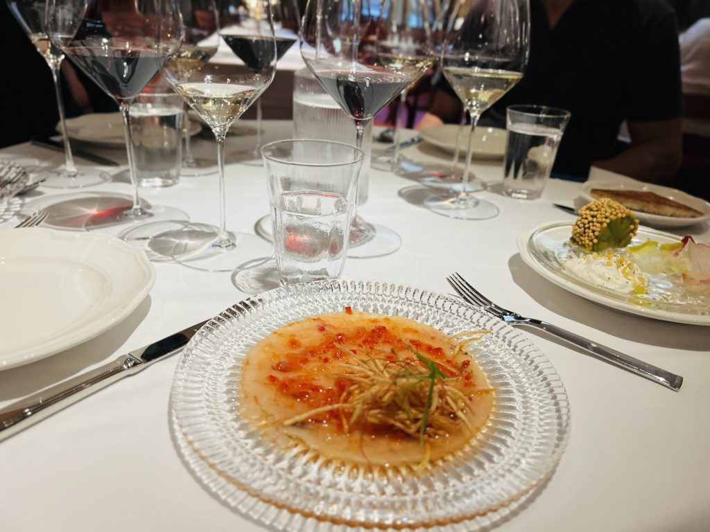 Som grädden på moset en riktigt god hummercarpaccio med skaldjursemulsion, potatisstrings och picklad röd jalapeno.