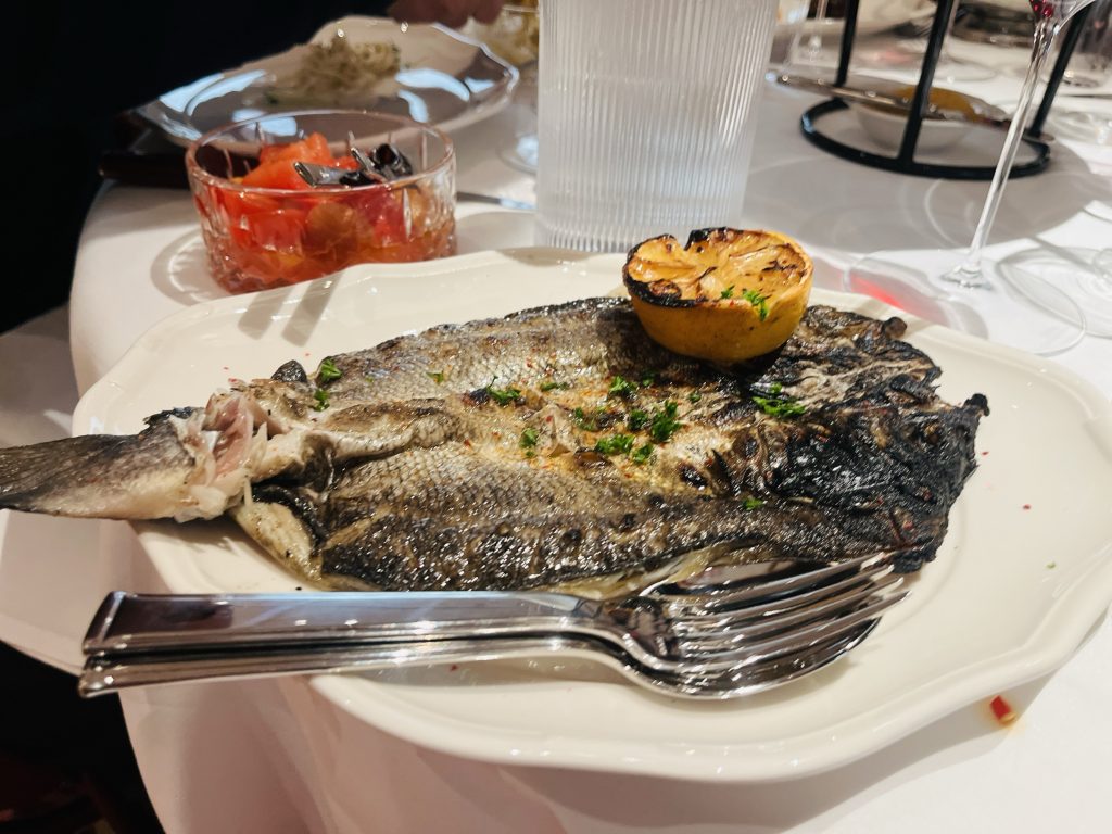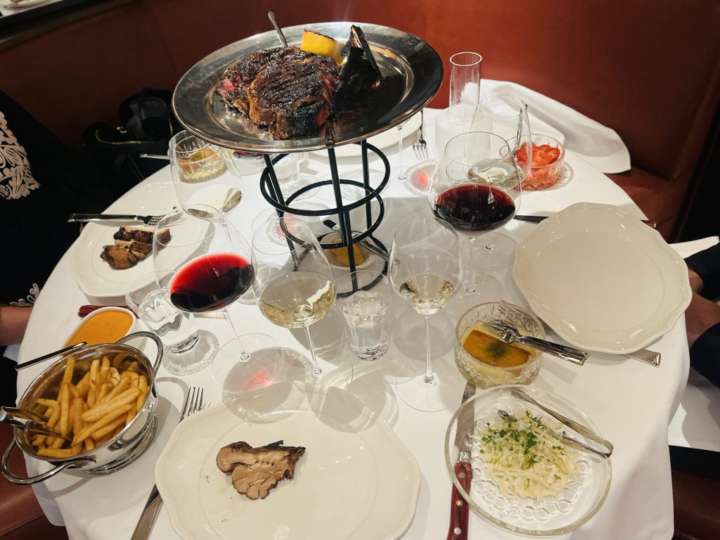 Till huvdrätt fick vi in en 850 gram entrecôte och en hel abborre och igelkottsvamp till vegetarianen. Plus massor av goda tillbehör såsom riktigt krispiga pommes, olika sorters såser och sallader. Hela menyn var verkligen en perfekt smakkombination. Vi var fyra personer som delade på denna menyn och det räckte gott och väl.