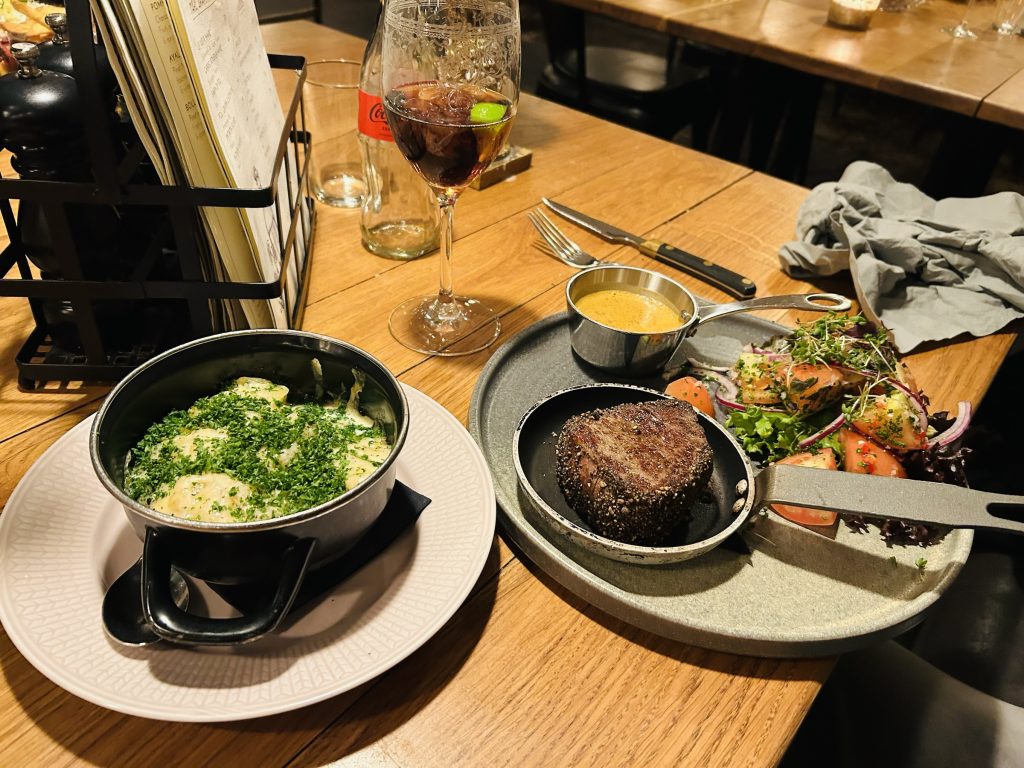 Killarnas favorit varmrätt blev helt klart den konjaksflamberade oxfilén som var pepparrullad och serverades med potatisgratäng, en ritkigt god tomatsallad och en pepparsås.