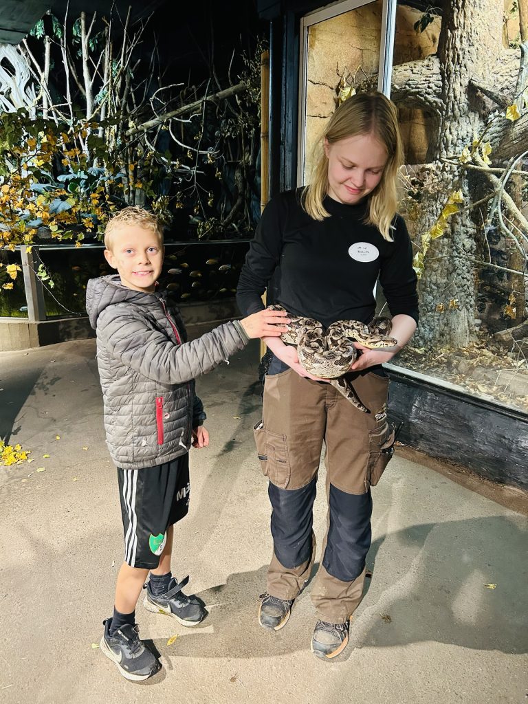 Men den allra häftigaste upplevelsen var såklart i regnskogen när han fick klappa en orm. Vi gick dit strax innan de stängde och då tog tjejen ut ormen, så lilla L fick klappa den.