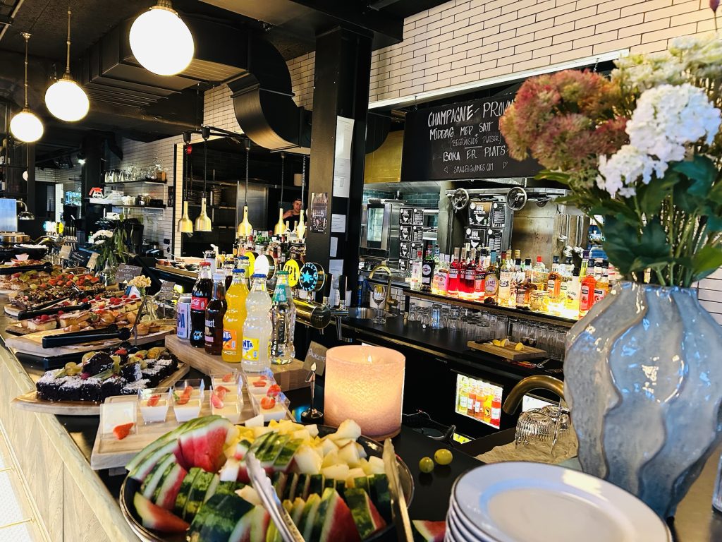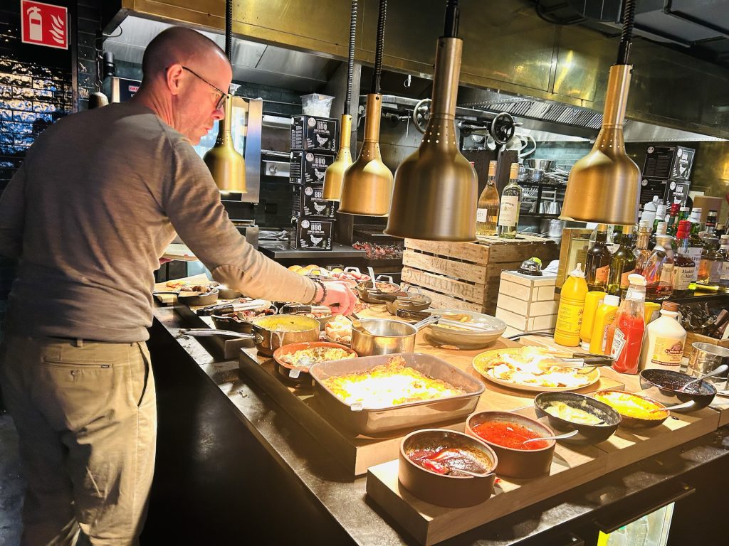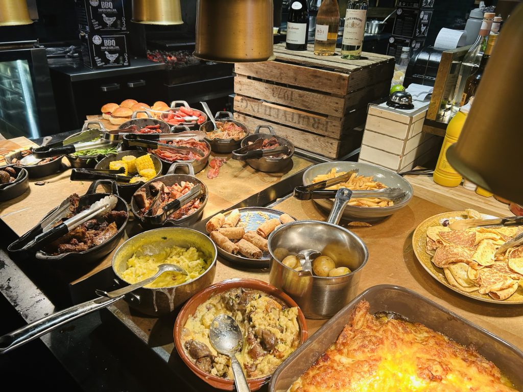 På den varma buffén  samsas kolgrillade ribs,  BBQ-kycklingklubbor med klassiker som äggröra, bacon och prinskorv. En god gräddig potatisgratäng och krispiga pommes som tillbehör och riktigt goda pizzor.