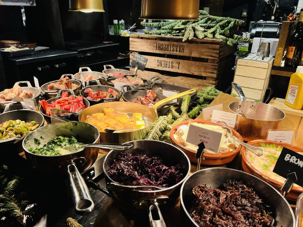 Bland de varma rätterna fanns ett alldeles lagom utbud. Fantastiskt goda köttbullar och omeletter med räk och svampstuvning. Men såklart också lutfisk med tillbehör, prinskorv, brysselkål, stuvad spenat, revbensspjäll, brun – och röd kål och ja allt som hör julen till.